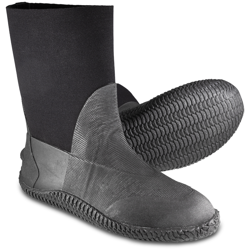 5 mm neopren, kraftiga gummiförstärkningar på foten och ordentlig sula.